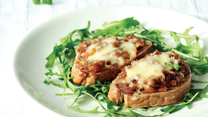 Karamellise sibulakattega kuumad võileivad sobivad hästi eelroaks või mõne supi kõrvale. Kui serveerid neid eelroana, võid asetada saiad salatipadjale.