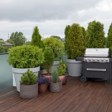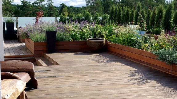 Praegu on terrassil 46 suuremat ja väiksemat taimeanumat, valdavalt okaspuudega. Eesmärk oligi kasutada igihaljaid taimi, et katusaed oleks roheline ka raagus aastapoolel. Elukaaslaste lemmikud on männid, neid on lausa 12 liiki-sorti. „Männid tekitavad sellist õiget ja head olemist, neil on mõnus lõhn,” leiavad mõlemad.