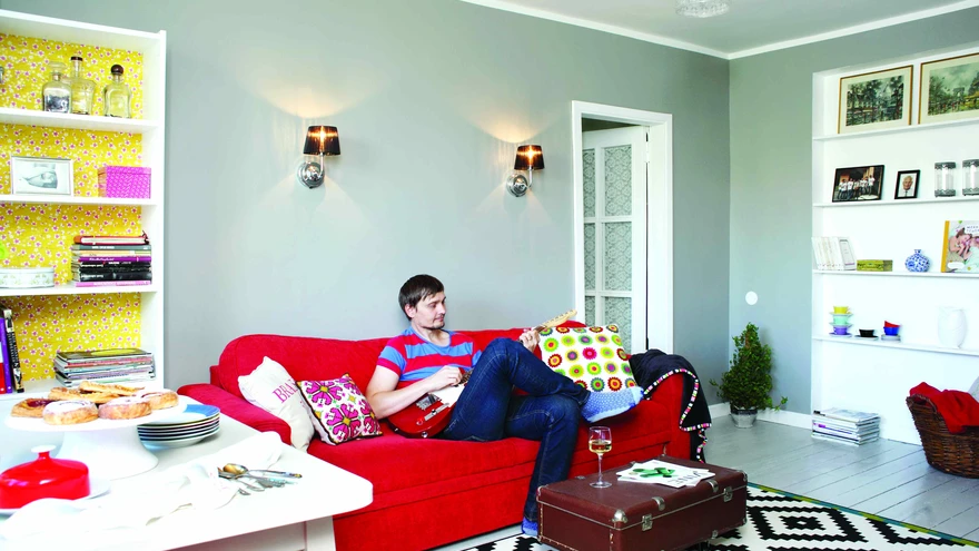 Kuna perenaine Marika on usin heegeldaja ja armastab väga käsitööd, siis püüdsin luua tema loomingule head tausta. Korterit esimest korda üle vaadates jäi mulle silma, et kuigi päike otseselt sisse ei paista, on siin siiski üsna palju valgust. Valgusküllases korteris võivad seinad olla ka veidi tumedamad. Et aga ruutmeetreid on vähe, sobis põrandale paremini heledam toon. Nüüd joonistuvad tumedavõitu seinte taustal eriti kenasti välja valged põranda- ja ukseliistud ning korteri algusaegadest pärit klaasruutudega puituksed. Üsna kujundamise algstaadiumis leidsin vanakraamipoest toreda ja praktilise punase diivani, millest sai kogu korteri dominant ja värvidikteerija.