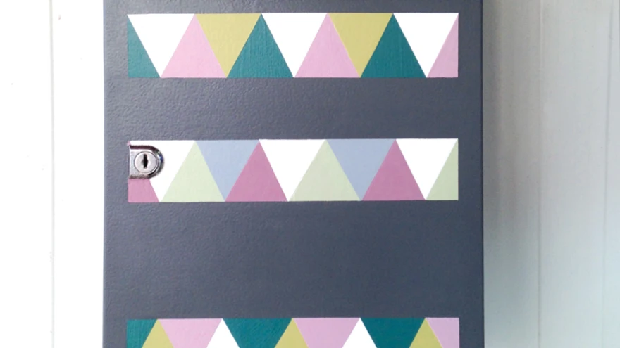6. Tee mustri tarvis kavand ning kanna see postkastile. Selle postkasti puhul soovisime, et muster oleks silmatorkav, kuid ei riivaks silma, seetõttu valisime tumehalli põhitooni, millelt paistab hästi välja ka mahedamate toonidega tehtud muster.