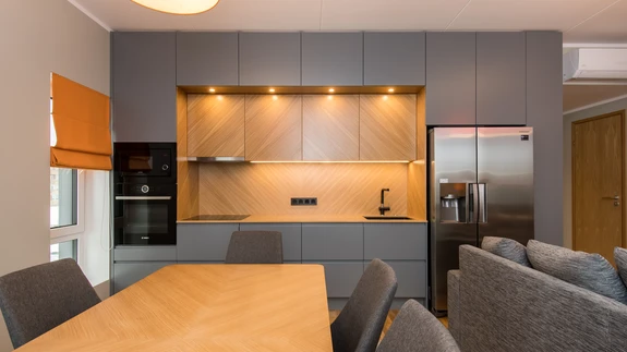 Keskmist trendikööki iseloomustavad näpujäljevaba pinnatöötlusega siledad mattuksed, metallraamis klaasvitriinid ja laeni kapid, mis on valdavalt hallikasbeeži tooni....