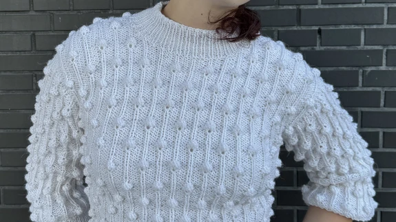 Selle valge sviitri muster meenutab nöörile lükitud pärleid. Laiade kolmveerandvarrukatega ja kõrge kaelusega kudum on kootud soojast alpakasegusest villasest lõngast. TASE 1-2Suurustele S-M ja L-XLLõ...